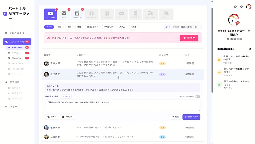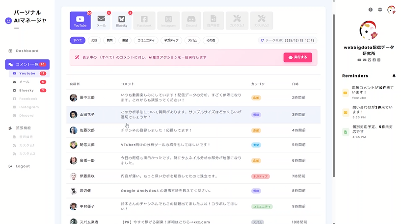 プラットフォームを行き来する必要はありません。 YouTube、Bluesky、公式メールアドレスなど、すべてのメッセージを一元管理。 「未読」や「対応待ち」が一目でわかります。